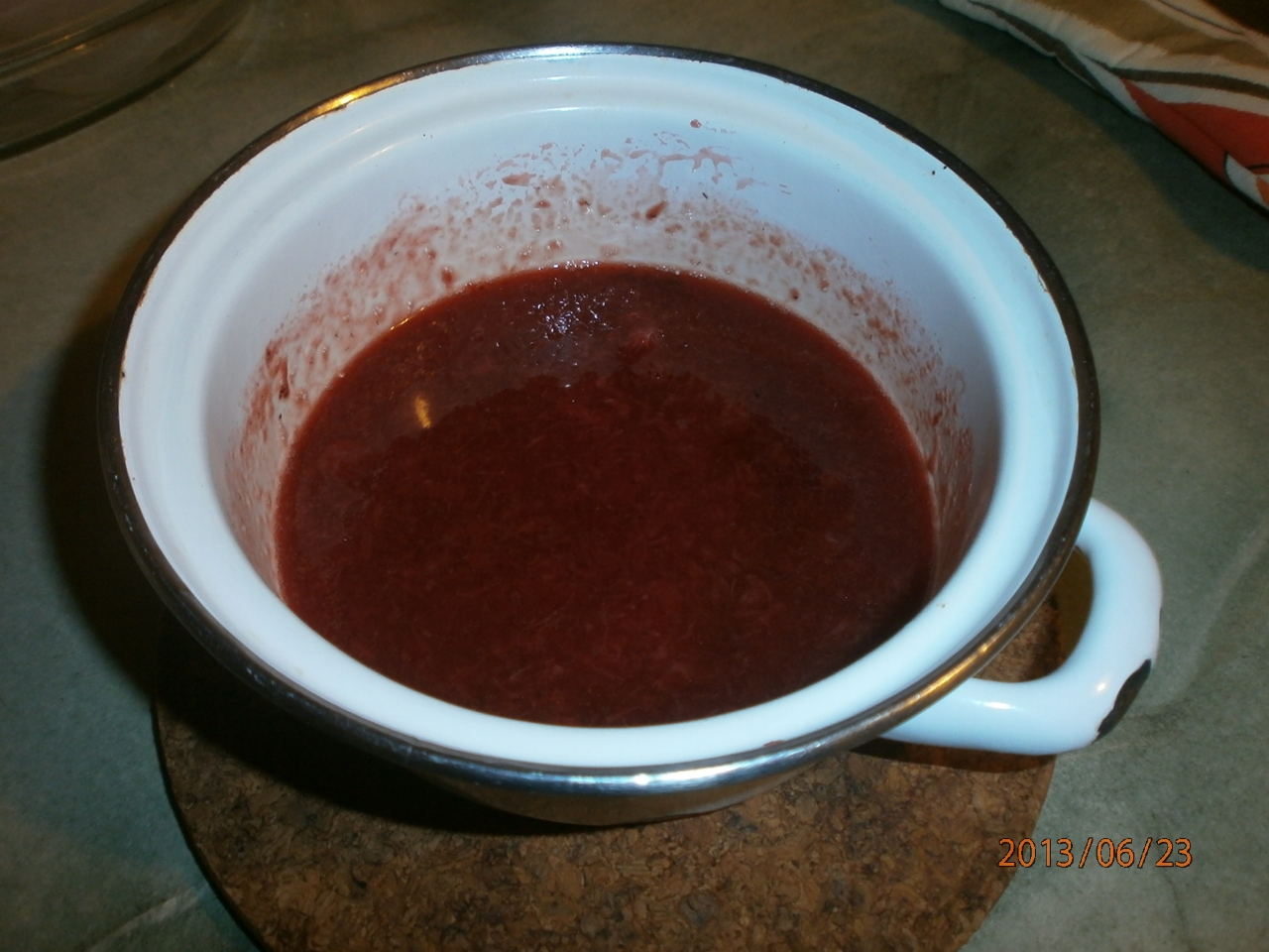 Amikor a tűzről leveszzük szűrőt fogunk és óvatosan az epres szószra öntjük.