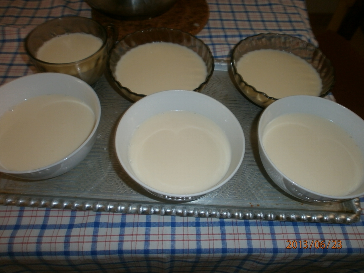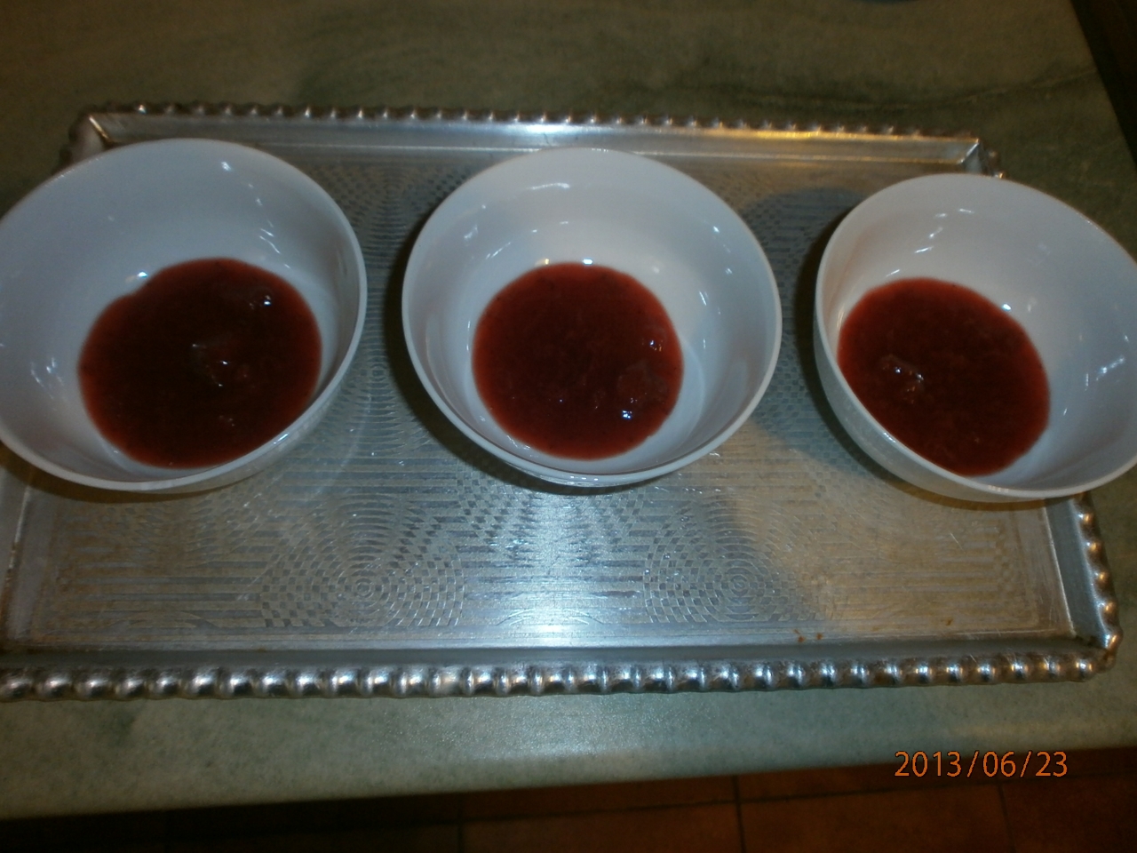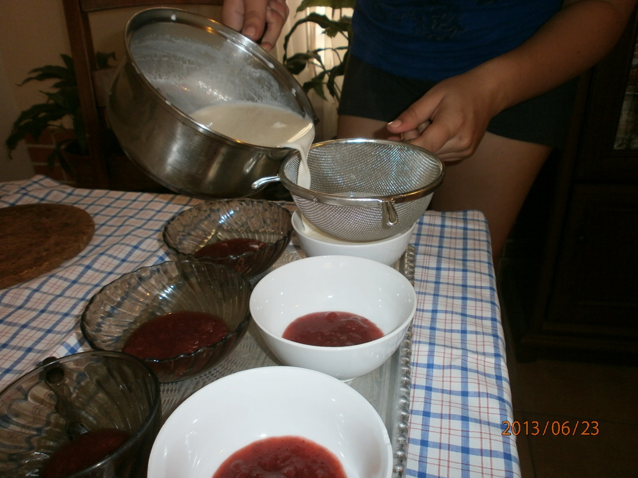 Minden egyes tálba ugyanannyi mennyiségű folyadékot töltönk. És ha kész hűtőbe téve 6 órán át vagy szilárdulásig hűtjük. Utána eperrel díszítve fogyasztjuk.