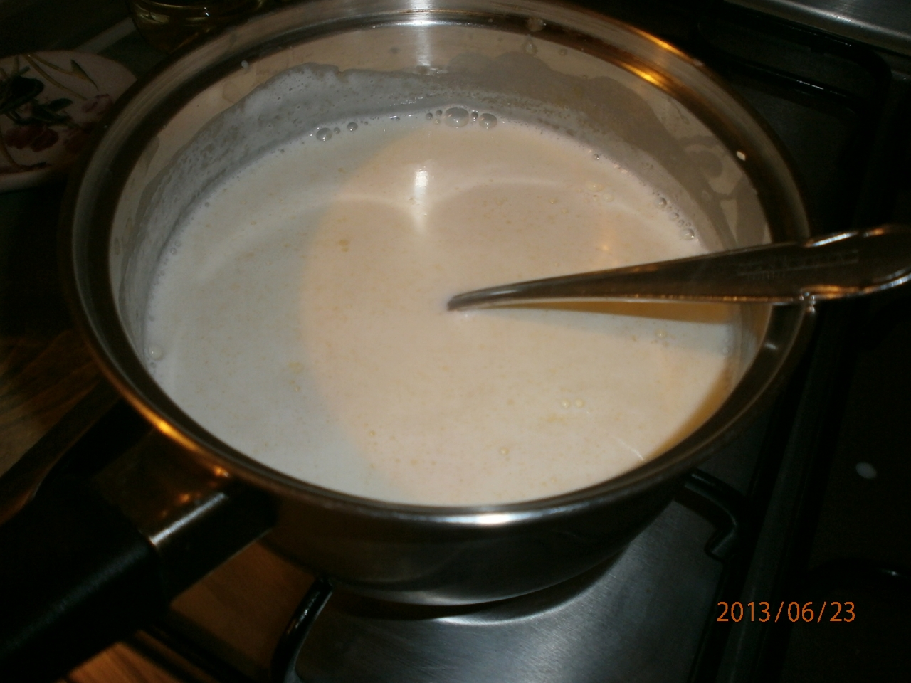 A tejet a tejszínt és a vaniliát egy lábosba teszem majd kevergetés melett forralásig főzöm. A cukrot és a zselatint alaposan összevegyítem és hozzáadom a tejes krémhez.